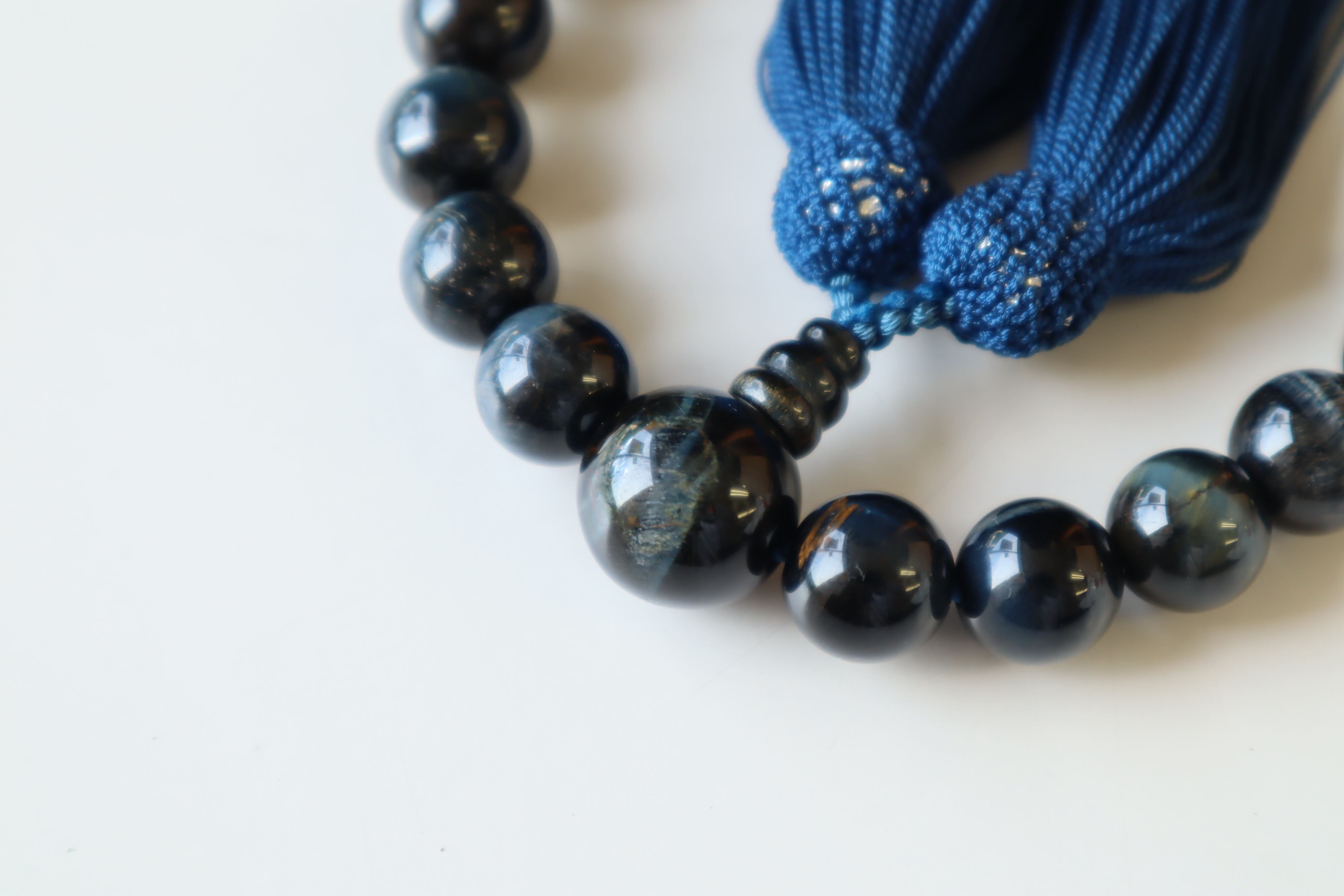 濃い青の中に虎目特有の縞目が見える上品な天然石の青虎目石を使用した念珠です。